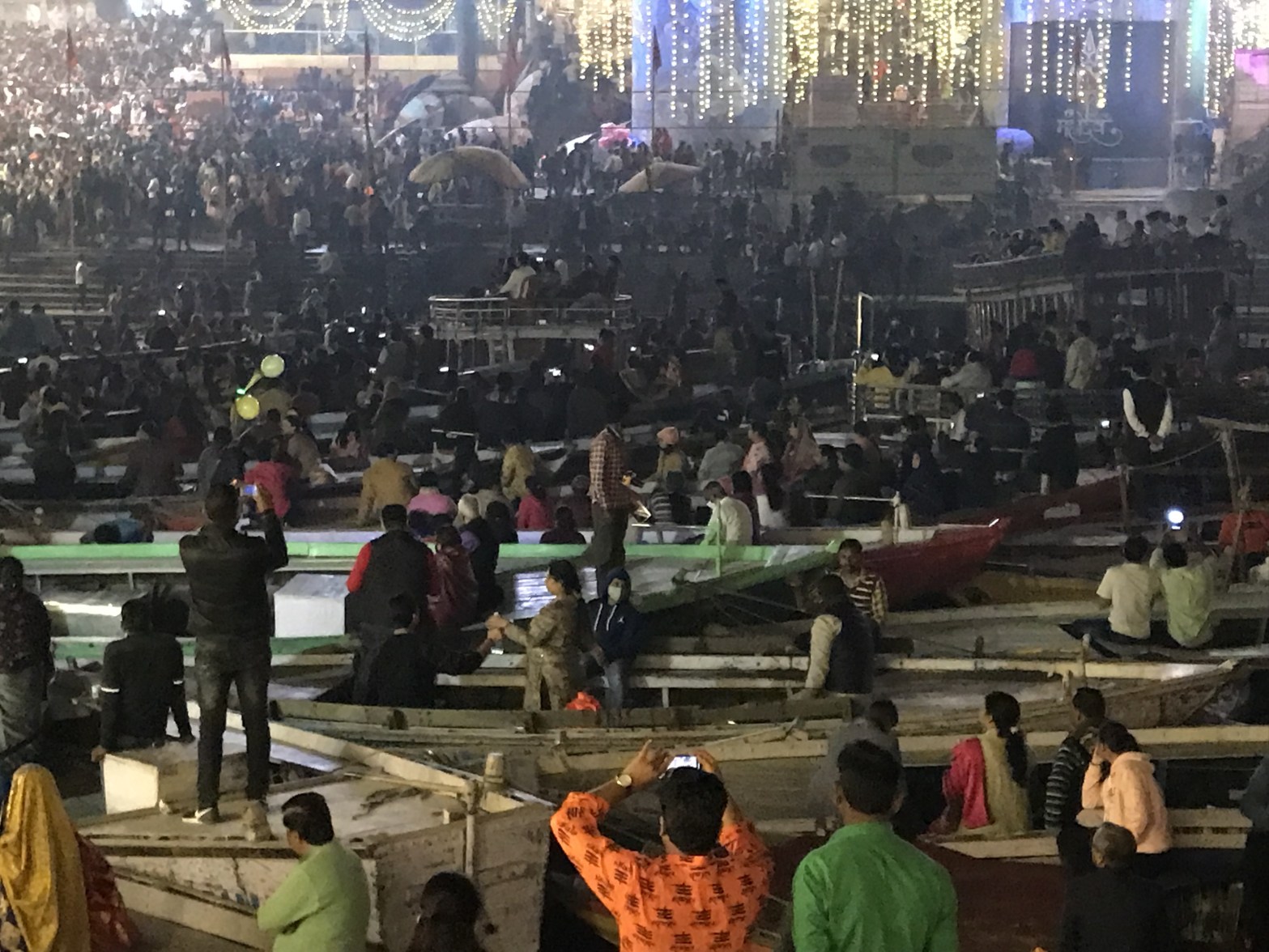 Ours were one of the larger boats which inserted themselves in the melee of boats adjoining the Dashashwamegha ghat. As the twin barges moved closer to the stone steps of the ghat, to get a better view, they pushed some of the smaller boats aside, making way for themselves. After a few minutes of jostling for space, the boatmen finally found a suitable space for their boats, floated into it, and killed the engine. And then we waited….